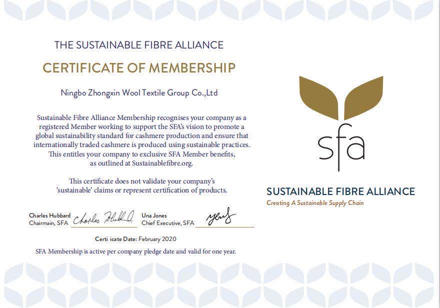 為推進羊絨產(chǎn)業(yè)綠色可持續(xù)發(fā)展,寧波中鑫經(jīng)過前期準(zhǔn)備、申請和認(rèn)證,于2020年2月20日正式加入了SFA(Sustainbale Fibre Alliance)組織。