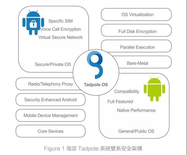 基于系統虛擬化技術,在單一核心下執行兩個完整的Android系統。每一個Android系統皆具備完整的執行功能并且兼容于第三方軟件。兩個Android系統互不依賴,完全獨立。當Tadpole系統啟動后,可視需求或環境狀況只啟動任一系統,也可以據實際狀況完全關閉任一系統。例如在極機密環境中,公開日常系統 (Public/General OS) 就完全關閉,而不僅是隱藏在背景執行。