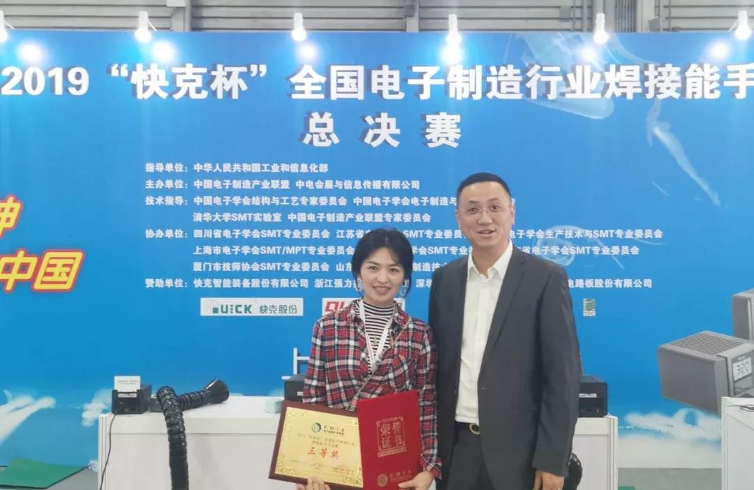 日前,2019年“快克杯”全國(guó)電子制造行業(yè)焊接能手總決賽在上海新國(guó)際博覽中心舉辦。成都航天電子裝調(diào)事業(yè)部侯本麗同志榮獲季軍。