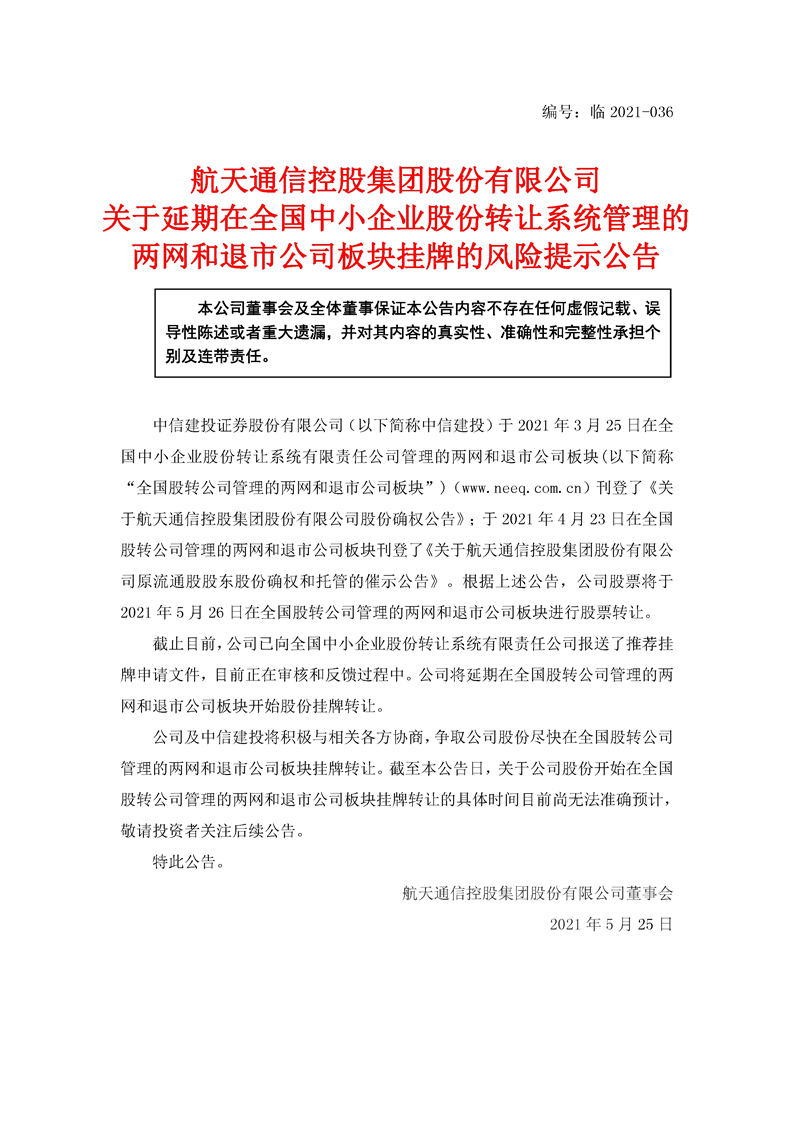 航天通信控股集團股份有限公司關于延期在全國中小企業股份轉讓系統管理的兩網和退市公司板塊掛牌的風險提示公告